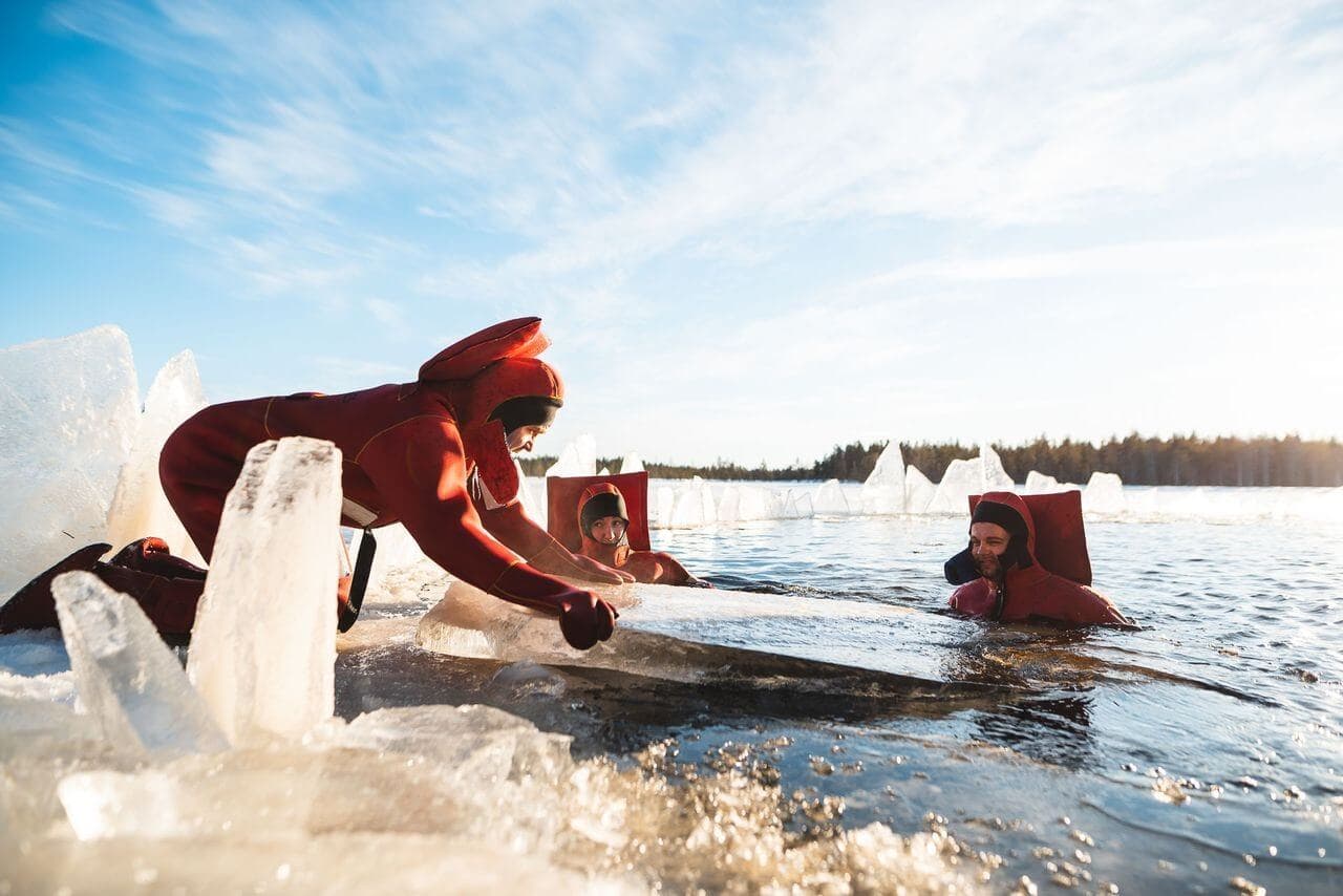 Do what you never thought you would be doing in your lifetime! Swim in an icy lake in the north of Finland in the middle of winter! Brace yourselves, as we are about to introduce you to the craziest adventure we could think of - winter ice floating! We will dress you up in special rescue floating suits made of light, waterproof material that will keep you warm and dry, so you can spend as much time in the water as you like.