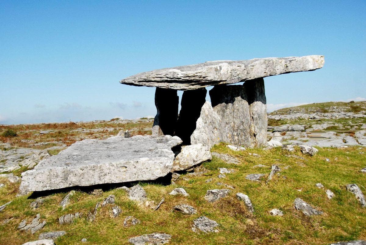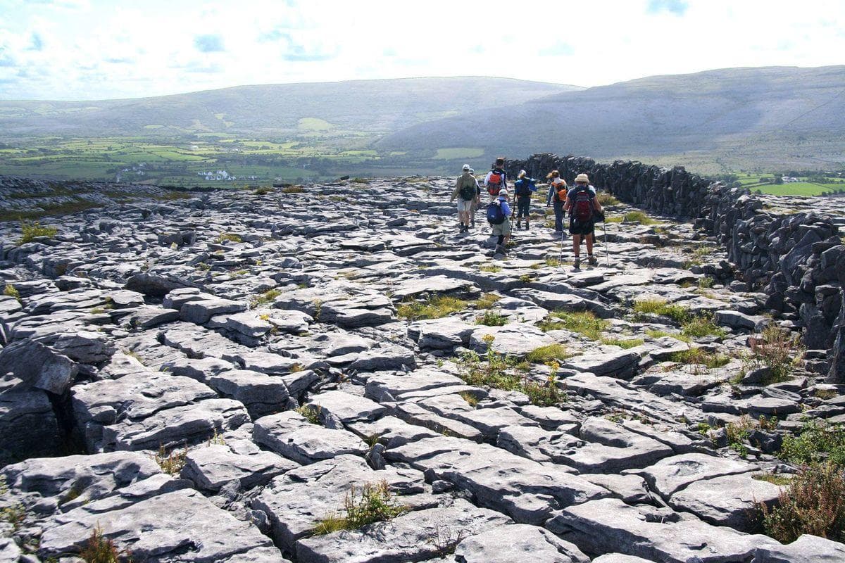 The Burren and Connemara face each other across Galway Bay, with the glorious Aran Islands strategically placed in between. It is hard to imagine two more contrasting landscapes. ''Burren'' is derived from the Irish word boireann meaning ''place of stone'', and the name could not be apter. There is no part of Ireland where rock so obviously dominates the landscape as it does in the Northwest corner of County Clare. The Burren covers an area of some 260 square kilometers and is famous for its bare limestone pavements dissected by deep crevices and traversed by countless stone walls.