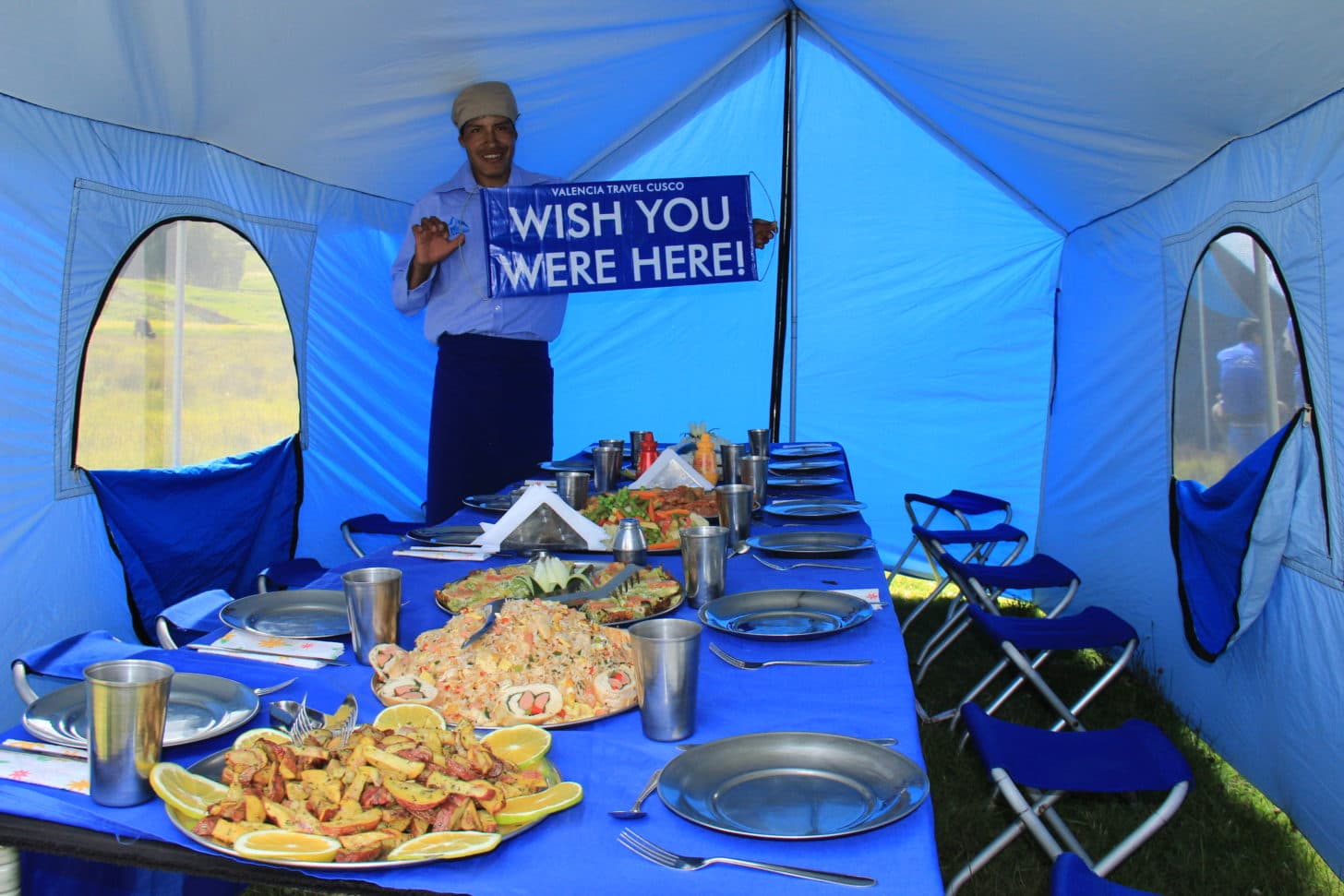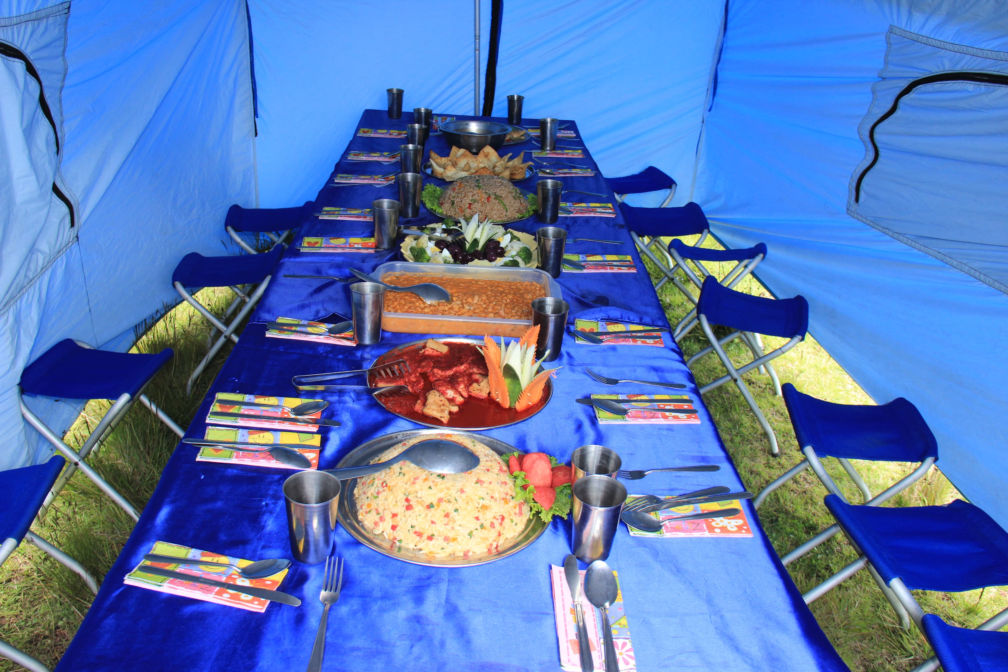 Dining room equipment which includes tables, chairs, and a dining tent.