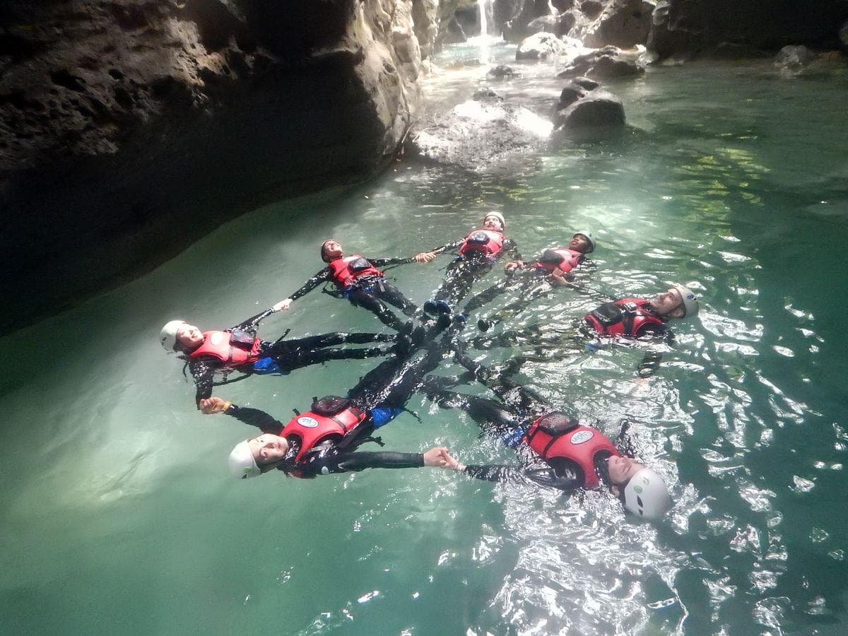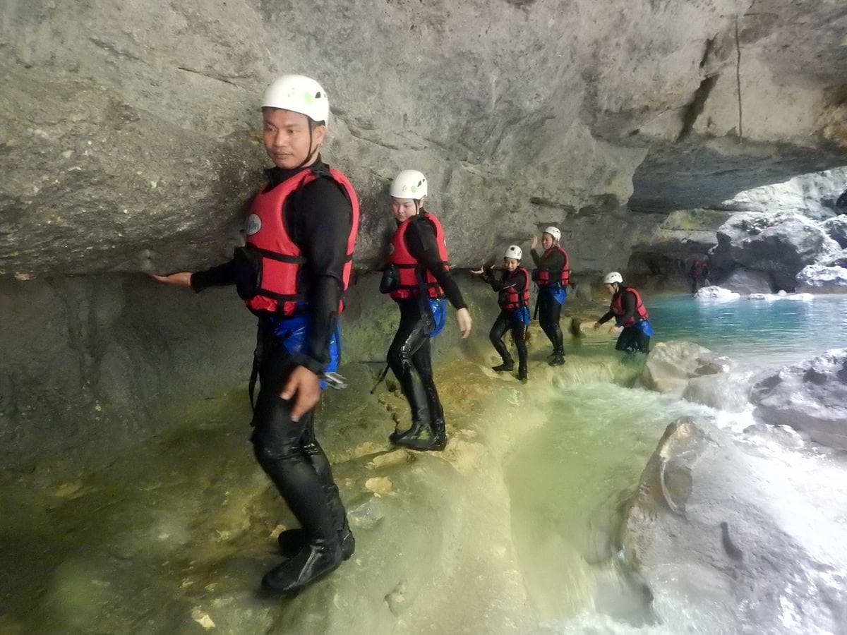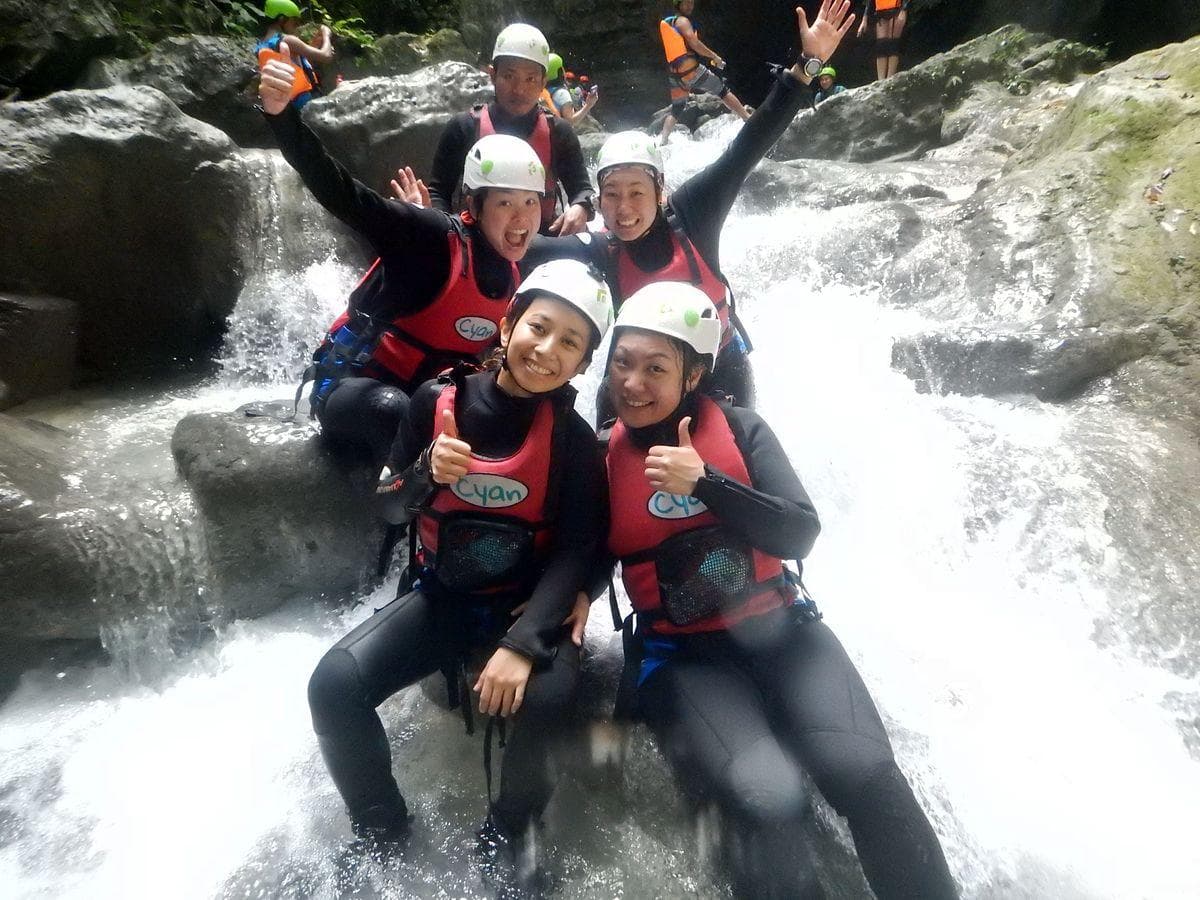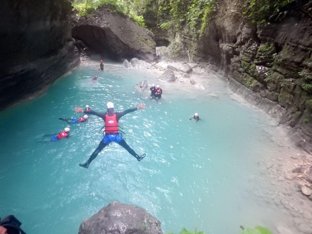 This Cebu Canyoneering trip is fun from beginning to end. Jumping, swimming and walking in and besides an amazing river that forms a beautiful canyon. With the help of our guides and equipment, you can try to jump from bigger heights. We start our Kawasan Canyoneering adventure by picking you up at around 8:30 am to 8:45 am within the Moalboal area and bring you first to our headquarters in Moalboal for equipment fitting and setup. Then at around 9:15 am we drive 45 minutes to reach the starting point. We now follow the river always downstream. Some parts are tricky, but our guides will always show you the easiest way and give you a hand. In between, we will have to make a couple of fun jumps. Lunch is included after our trip(around 2-3 pm). We will then head back to Moalboal at around 5 pm with some great memories and smiles on our faces.