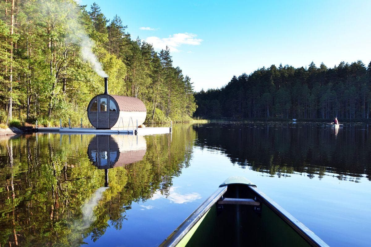 Our deep forest is a magical place, full of secluded lakes and creatures large and small. At first glance, you'll barely see the forest huts by the beautiful lake. Covered in moss they blend into all the shades of green of trees and shrubs. Life is simpler here. Fetch water from the spring, chop wood and cook your meals on an open fire. Sleep comfortably on sheep skins in your charming little hut and listen to the sounds of the forest. Nature is all around and you spend your days however you like. Paddle the lake in a canoe, hop in for a swim, enjoy the floating sauna. Wander the forest to collect mushrooms and berries, and delight in the wildlife you can spot on your own.
