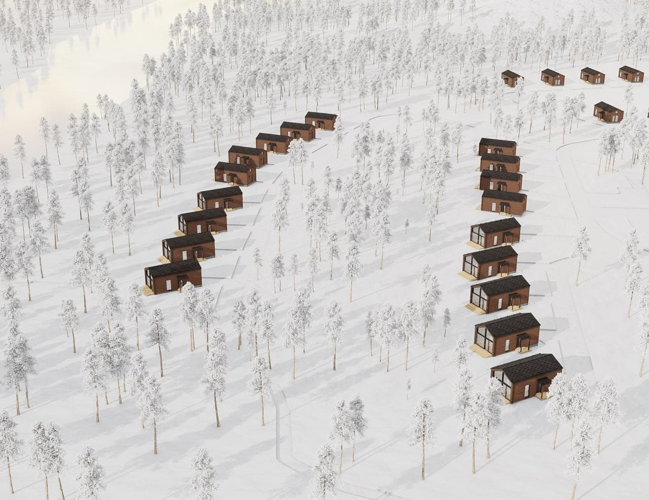 The Kukas 1 villas are positioned to offer beautiful views over the forest and the majestic Ylläs fells, with more villas nestled further down the slope.
