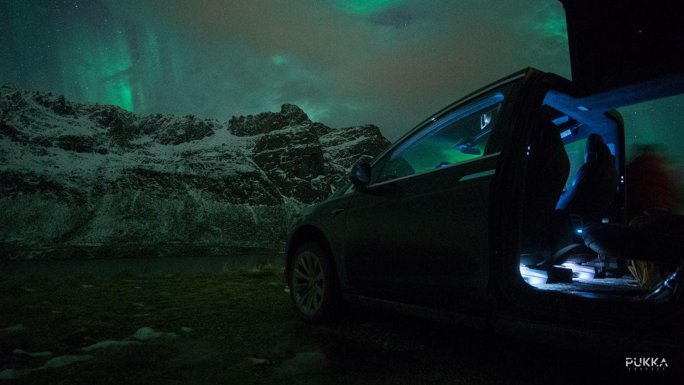 The most comfortable way to see the Northern Lights! With so many tour operators in the area, we have found that many visitors wish to have guidance on where to see the Northern Lights when venturing to the Arctic. We have something in common with you. The Northern Lights is exciting to us, we love nature, and experiences like these matter most when we will look back at our travels one day. We are one of the only tour operators in the North that provides Northern Lights tours in a Tesla Model X. A zero-emission, magically silent, powerful performance experience cruising in the next generation of cars along the Arctic roads. Our guides are professional and will help you with your camera settings as well as telling you about the history and science around the Northern Lights. The groups on this tour are small (only up to 5 passengers per car) to provide an exclusive feeling that we strive for. We provide gear to keep you warm — extra gloves, hats and boots. The car is equipped for safe winter driving with an effective heating system to make sure you are comfortable at all times.