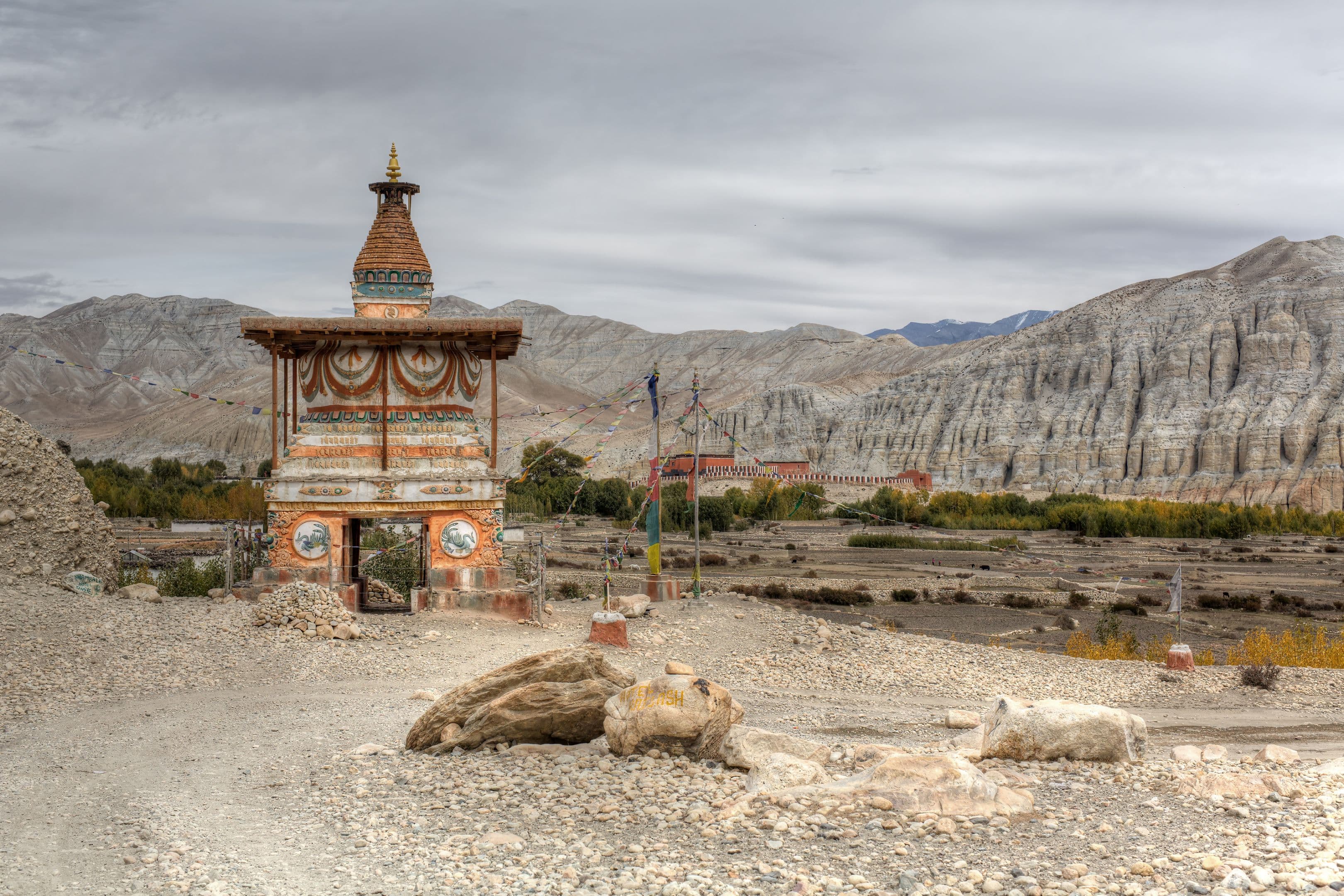 As you move northward past Kagbeni, the official gateway to Upper Mustang, the environment shifts dramatically—lush greenery gives way to stark desert scenery marked by windswept cliffs, eroded canyons, and multicolored rock formations. This path is part of the ancient Trans-Himalayan trade route, once used by caravans traveling between Nepal and Tibet.