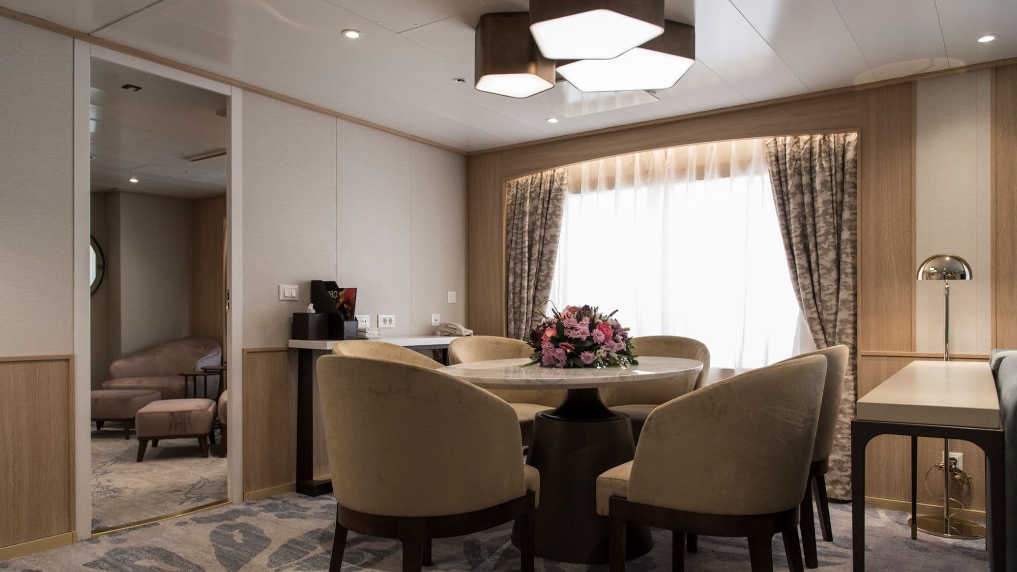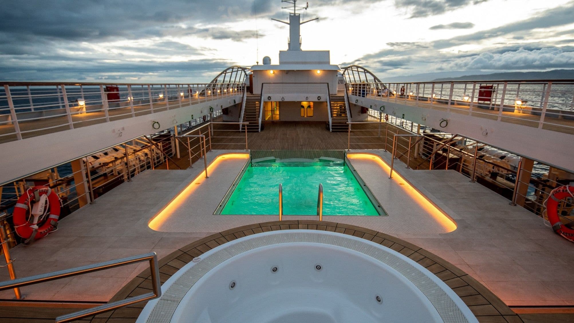 This intimate all-suite yacht features spacious ocean-view accommodations, each with a walk-in closet and updated double-vanity bathroom. On board, you’ll find a fully equipped fitness center, a spa with a complimentary sauna, an infinity pool, two full-service bars, on-deck hot tubs, a water-access marina platform, and so much more.