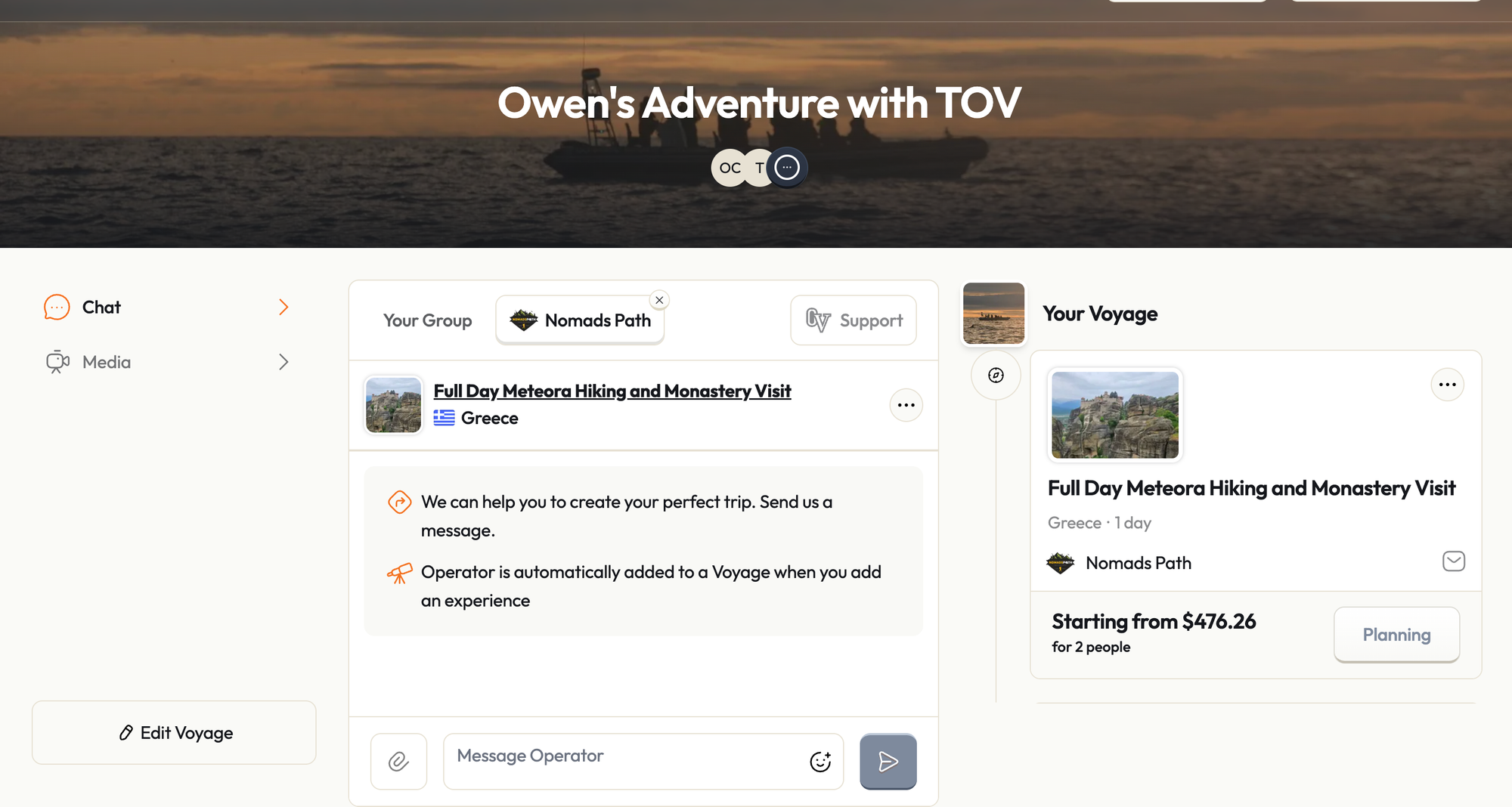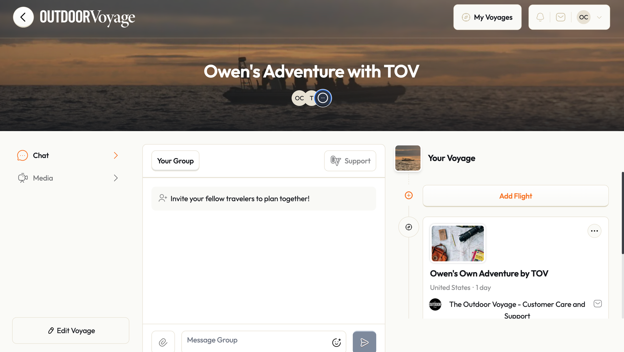When you find Adventures you like, you can add them to your Voyage page. As we mentioned above, on your Voyage page you’ll have access to several chats, one with your fellow travelers for brainstorming and planning, one for each operator hosting any adventures you’ve added to the Voyage, and another connecting you directly to OutdoorVoyage support.