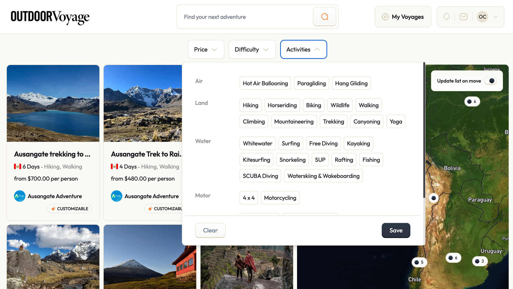 This modifier lets you further refine your adventures. You might search for “Land” and then narrow it down further by searching specifically for “Climbing” and “Mountaineering” adventures. In addition to the three big activity classes (Land, Water, Air), there are also smaller subcategories for motorsports, snowsports, sailing, and lodging. As we continue to expand OutdoorVoyage, you’ll see even more options appear!